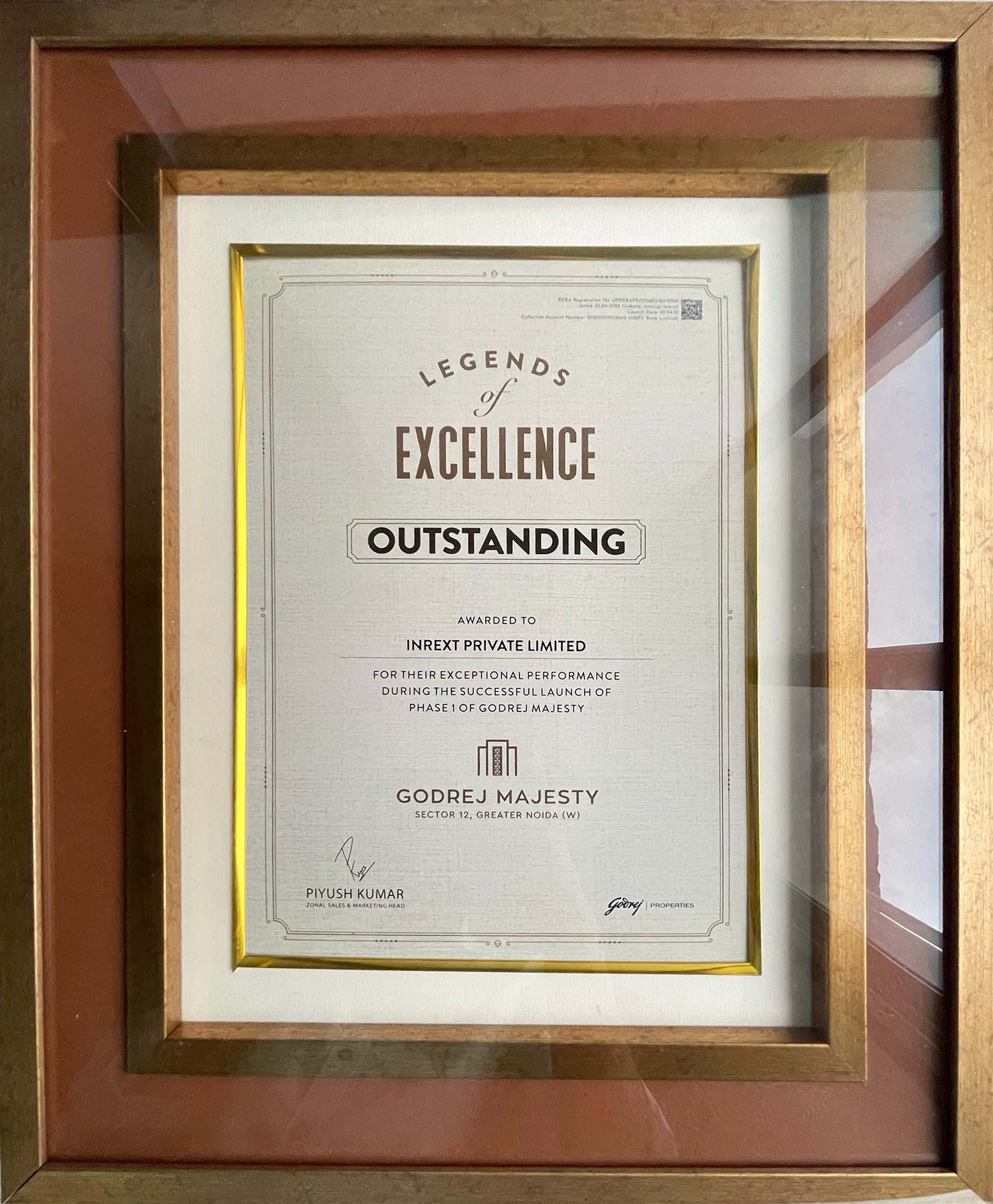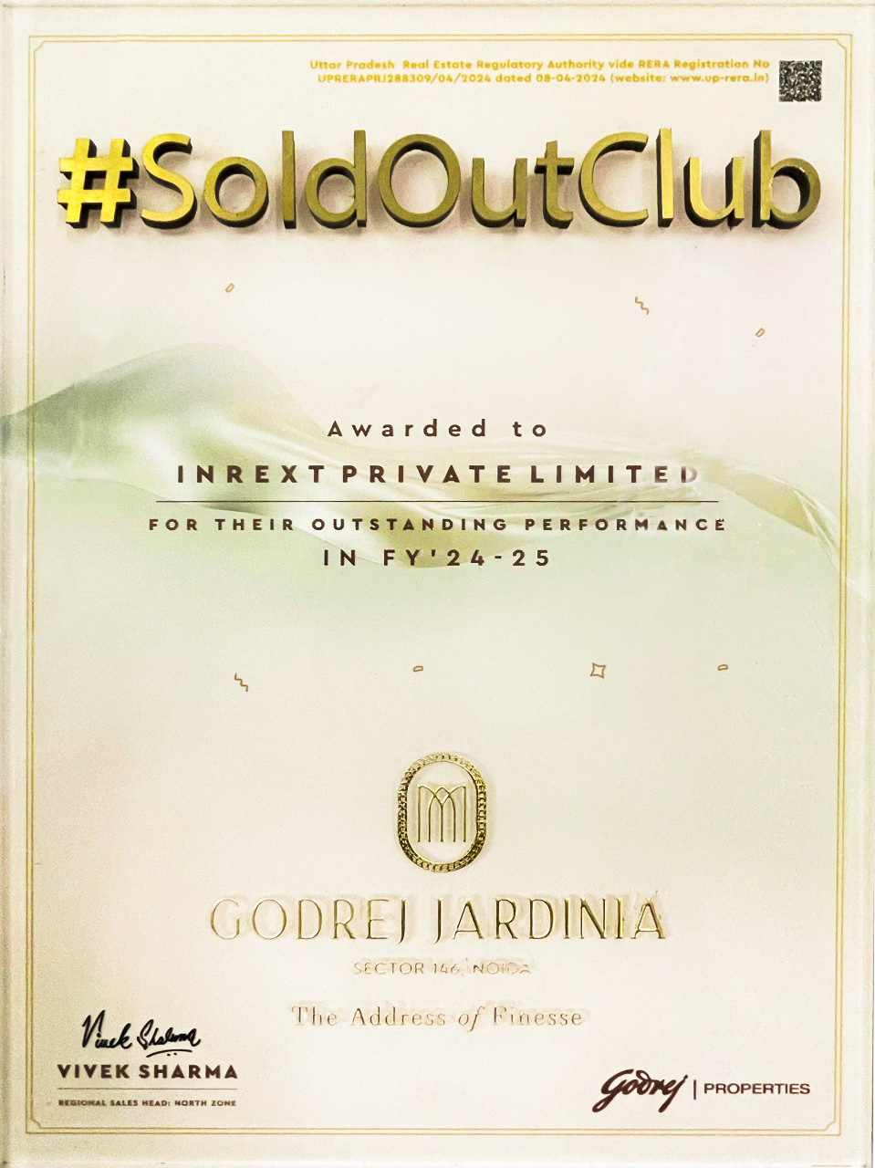 Inrext Private Limited has been honored with the prestigious #SoldOutClub Award by Godrej Properties for our outstanding sales performance in FY 2024–25 at Godrej Jardinia, Sector 146, Noida. This recognition reflects our unwavering commitment to excellence, trust, and results in the real estate landscape