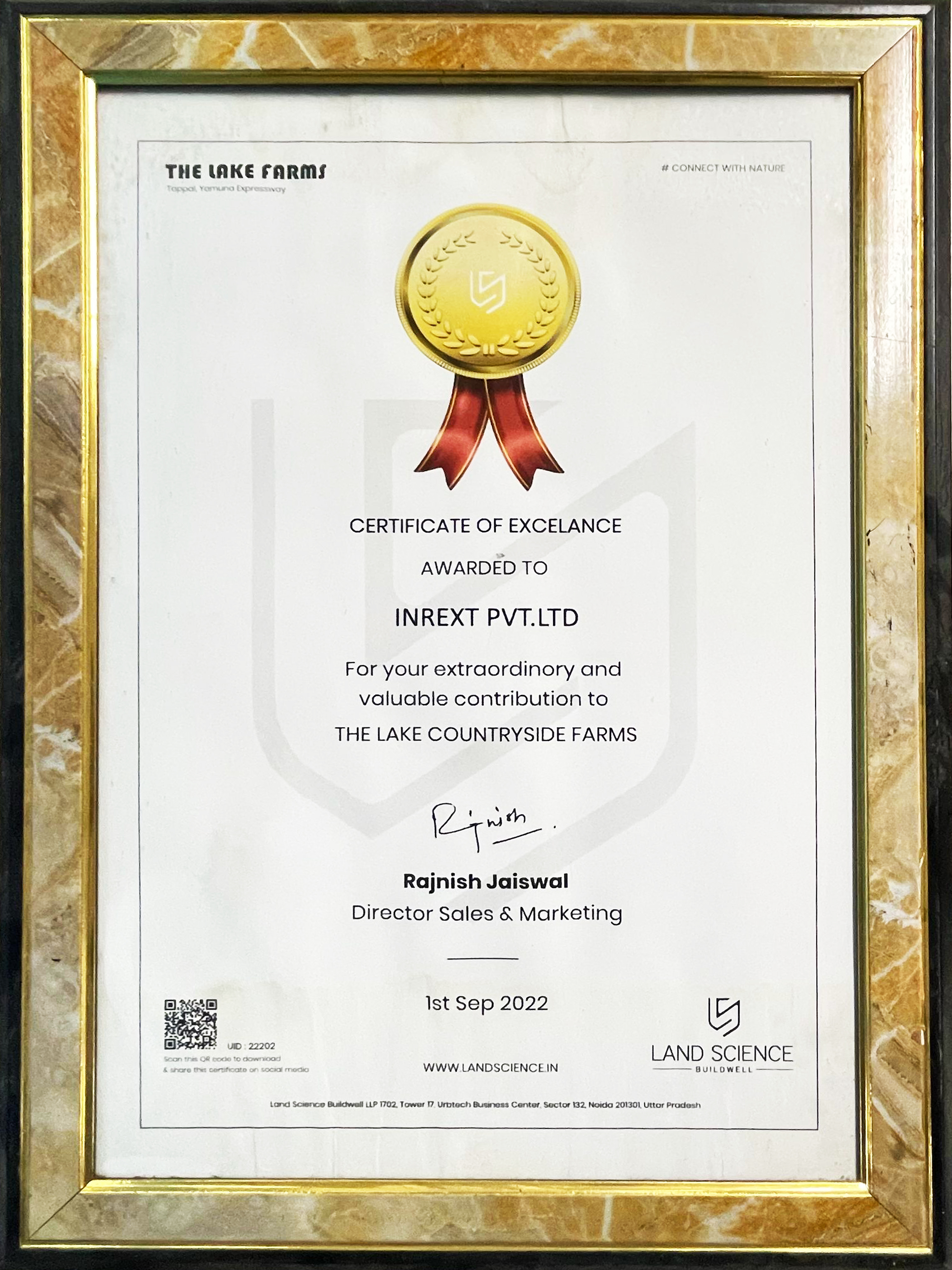 Awarded the Certificate of Excellence by Land Science Buildwell, this recognition celebrates Inrext’s extraordinary contribution to The Lake Countryside Farms. It reflects our commitment to delivering lasting value and fostering trust in every collaboration.